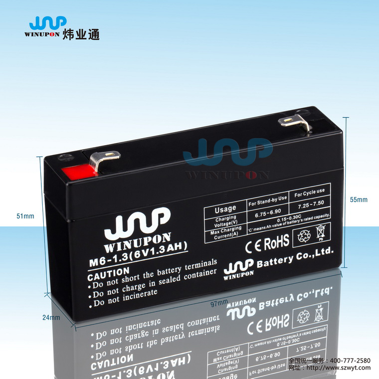 | 規(guī)格型號 | 6V1.3AH | 外形尺寸(±2mm) | 約重0.30KG | |||