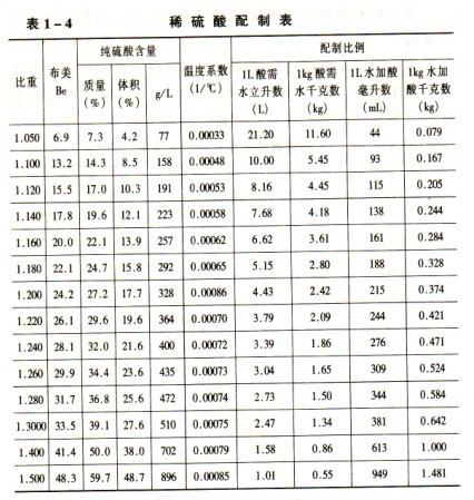 制取純水的方法有蒸餾法、陰陽樹脂交換法、電阻法、離子交換法等。因水中的雜質是鹽類離子,所以水的純度用電阻率來表示。國內制造廠主要用離子交換法制取。其總含鹽量小于lm9/l,水電阻率為(80~1000)×104Ω.mm(25 0C)。鉛酸電池電解液(稀硫酸)配制見表l-4。濃硫酸加入水稀釋,會發生體積收縮,故混合體積值應適當增大。