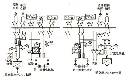(3)方案三:單母線分段(一組蓄電池,兩套充電裝置)接線,見圖2-3。特點:接線可靠、靈活,一組蓄電池經(jīng)兩個空氣斷路器分別接到兩段母線上。兩套相同容量的充電裝置接在不同