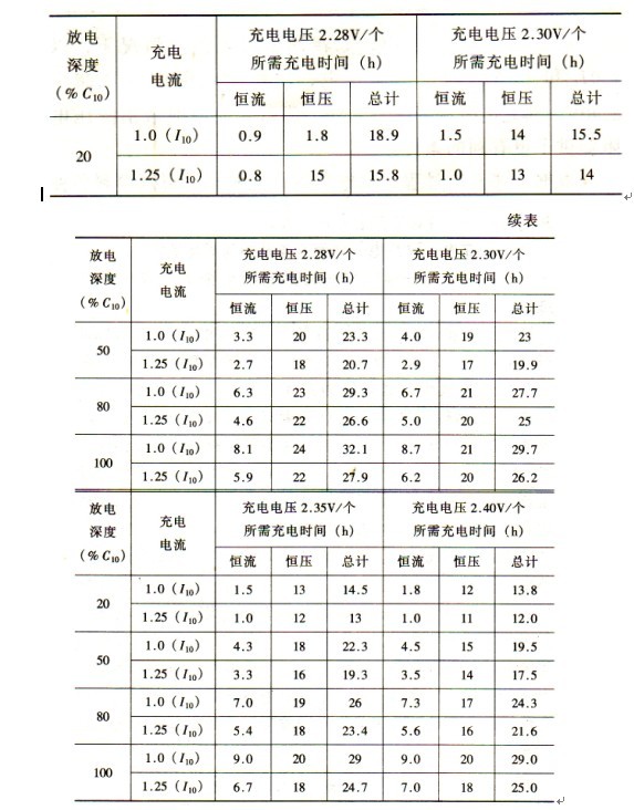 初充電一浮充電一均衡充電是按下列程序循環進行的。在投運前,對電池進行初充電,此時用恒流為l.Oll0進行充電。當單體電池電壓上升到2.35V轉為恒壓充電,此時充電流逐漸減少,然后轉為正常運行狀態即浮充電壓為2.25V。當運行720h后,進行均衡充電,即先以恒流l.Ollo電池充電,至電池電壓為2.35V轉為恒壓充電,電壓恒定一段時間又轉為正常浮充狀態。當交流電源中斷后,此時自動 進行均衡充電,以恒流l.Ol】o充電。電池電壓上升至2.35V后和上述運行初充后均衡充電的過程相同。上述兩階段充電,其浮充轉均充的判斷大多采用時間來整定,即不論放電幅度如何,一日由恒流階段轉入恒壓階段后,延時若干個小時,則自動轉為浮充。實際情況是充電所需時間與放電幅度有關,如圖3-1所示。因此事故放電的深度是隨機的,若用一個固定的時間來操作,則有可能造成電池的過充或欠充,所以采用蓄電池回路的充電電流作為均充終期的判據是較合理的。不同放電深度后充電的所需時間見表3-1。表3-1    不同放電深度后充電所需時間