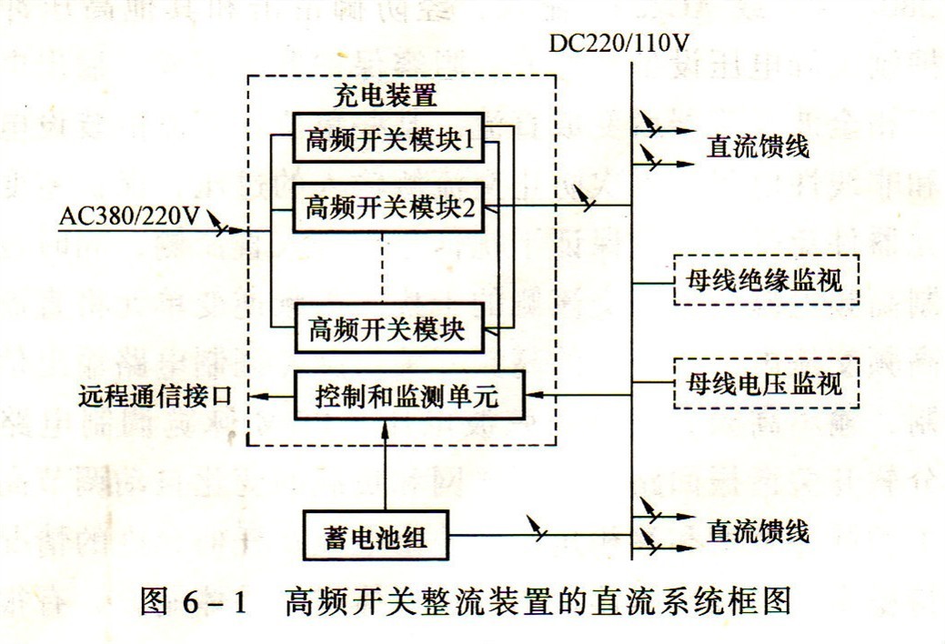 直流系統(tǒng)的蓄電池充電裝置根據(jù)負(fù)荷要求可為幾十安至幾百安。因高頻開(kāi)關(guān)模塊目前生產(chǎn)的lIOV為10~80A,220V為5~40A,故充電裝置要由多個(gè)模塊并聯(lián)組成,高頻開(kāi)關(guān)整流裝置的直流系統(tǒng)框圖如圖6-1所示。