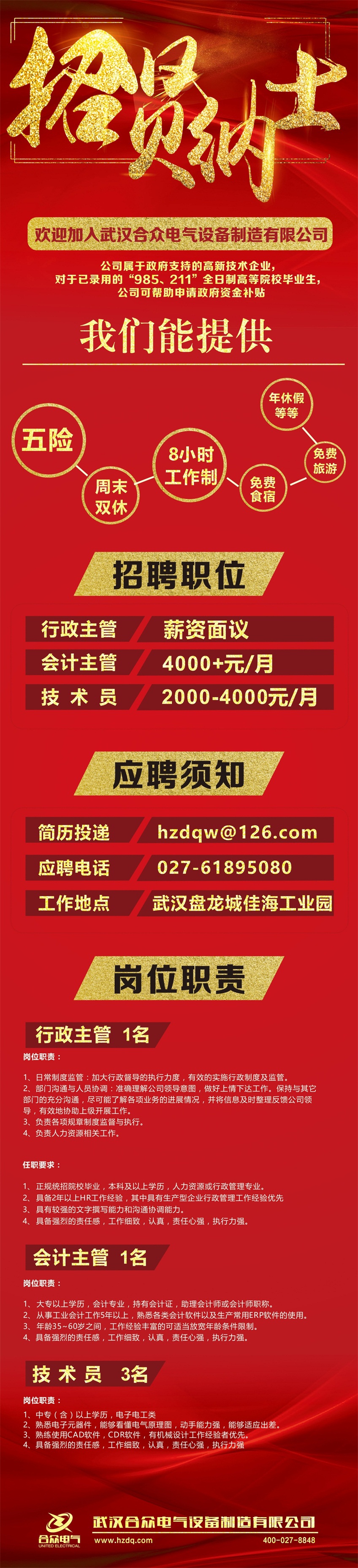 武漢市合眾電氣設(shè)備制造有限公司成立于2002年,注冊(cè)資金2100萬元,是一家專業(yè)生產(chǎn)和銷售電力檢測、試驗(yàn)設(shè)備的高新技術(shù)企業(yè)。公司擁有大批多年從事高電壓試驗(yàn)、檢測設(shè)備設(shè)計(jì)、生產(chǎn)的專業(yè)技術(shù)人才,嚴(yán)格按照國際化標(biāo)準(zhǔn)管理企業(yè),嚴(yán)格執(zhí)行ISO9001國際質(zhì)量體系標(biāo)準(zhǔn),堅(jiān)持不斷改革、創(chuàng)新。經(jīng)過多年積極努力經(jīng)營,已成長為一家集科研、開發(fā)、生產(chǎn)、銷售、服務(wù)為一體的高科技現(xiàn)代電力設(shè)備生產(chǎn)企業(yè),獲得行業(yè)眾多榮譽(yù),得到行業(yè)一致認(rèn)可。公司重視人才的培養(yǎng),定期為員工提供專業(yè)的技能培訓(xùn),為每位員工提供廣闊的發(fā)展平臺(tái),現(xiàn)因公司的業(yè)務(wù)的拓展和規(guī)模的擴(kuò)大,現(xiàn)招募以下職位,歡迎各位滿足條件的朋友踴躍報(bào)名,一經(jīng)錄用待遇從優(yōu)!