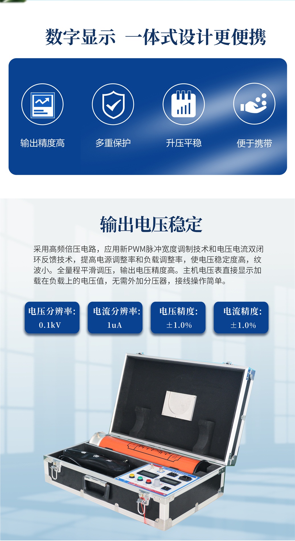 采用了高頻倍壓電路,應用了新的PWM高頻脈寬調(diào)制技術(shù),閉環(huán)調(diào)整,采用了電壓大反饋,使電壓穩(wěn)定度大幅度提高。使用性能卓越的大功率IGBT器件及驅(qū)動技術(shù),并根據(jù)電磁兼容性理論,采用特殊屏蔽、隔離和接地等措施。使直流高壓發(fā)生器實現(xiàn)了高品質(zhì)、便攜式,并能承受額定電壓放電而不損壞。具有輸出功率大、體積小的特點,有可靠的過壓、過流及零位合閘保護功能,帶0.75倍電壓切換功能。
