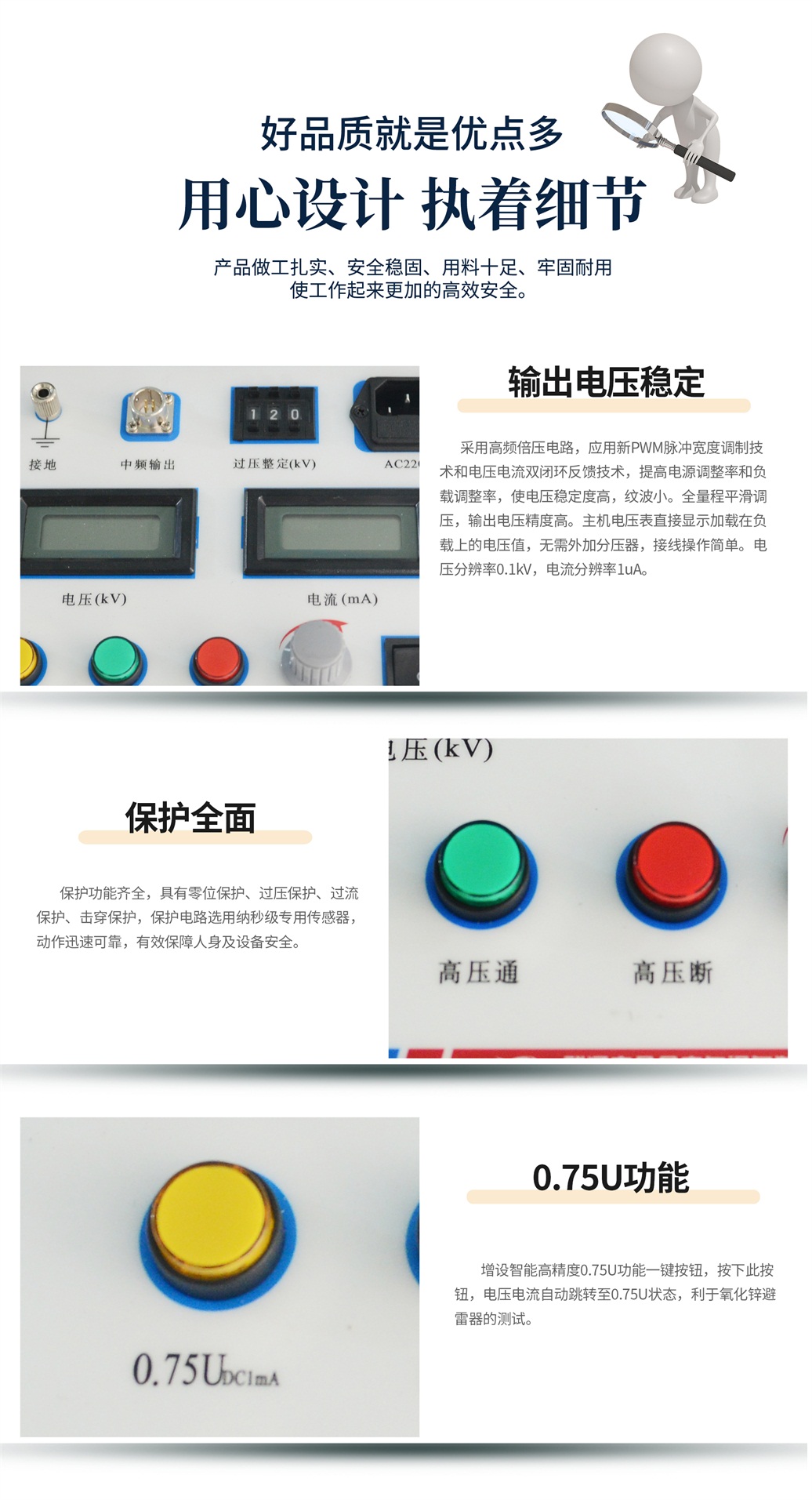 (5)增設(shè)高精度0.75UDC1mA功能,為做氧化鋅避雷器測量帶來極大的方便。