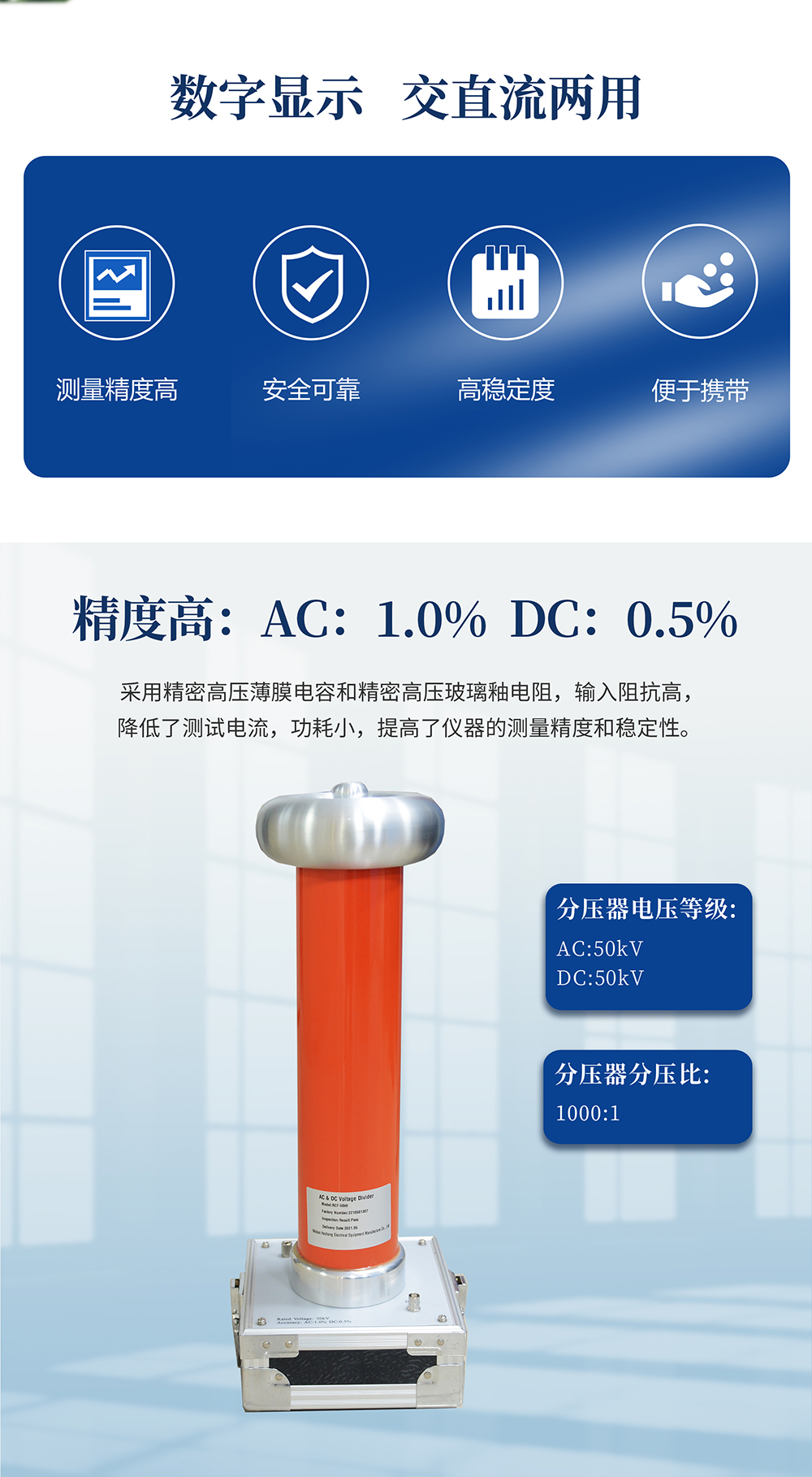 本產品作為高電壓測量之理想設備,主要用于電力系統及電氣電子設備制造部門測量工頻交流高電壓和直流高電壓。本儀器由高壓分壓器和低壓顯示表兩部分組成,兩者采用配套電纜連接使用。