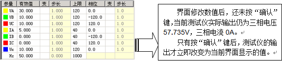 首先選擇“手動(dòng)”試驗(yàn)方式,在試驗(yàn)輸出狀態(tài)下,依次直接修改所需改變的各相的參數(shù)(幅值或相位)。按“確認(rèn)”鍵之前,盡管界面上的數(shù)據(jù)已經(jīng)修改,但測(cè)試儀實(shí)際輸出的電壓電流還是修改前的。全部修改完后按“確認(rèn)”鍵,測(cè)試儀的各相輸出立即同時(shí)改變?yōu)樾薷暮蟮闹怠S捎谶@種改變是各相同步改變的,所以能適應(yīng)某些突變量起動(dòng)的保護(hù)的輸出要求。