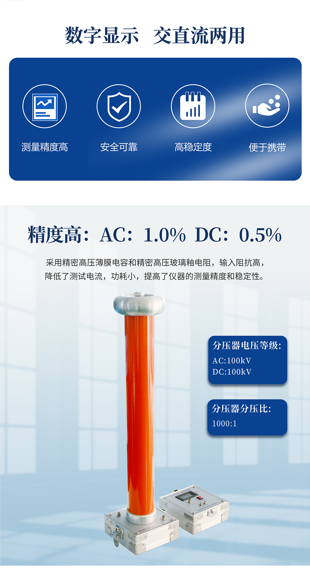 用于電力系統及電氣電子設備制造部門測量工頻交流高電壓和直流高電壓。參考標準:DL/T 846.1-2016