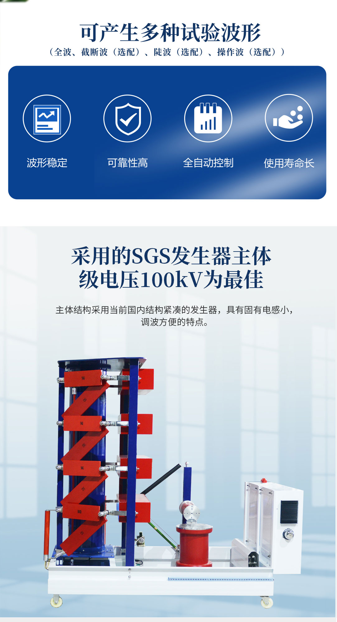 1、采用的SGS發生器主體,級電壓為100kV,符合當前國內外的發展趨勢。主體結構采用當前國內結構緊湊的發生器,具有固有電感小,調波方便的特點。