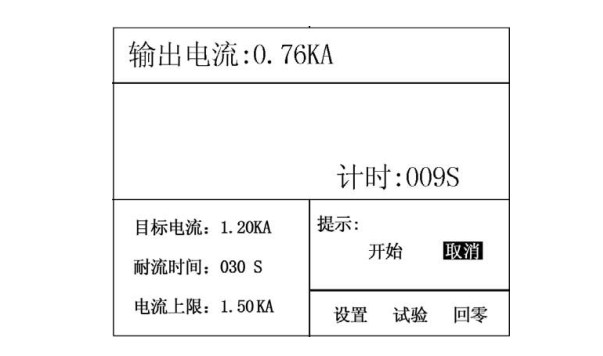 按上方法切換到“開始”確定后進(jìn)行試驗(yàn),與手動(dòng)升流試驗(yàn)不同之處就是升流過(guò)程將自動(dòng)升到“目標(biāo)電流”值,然后啟動(dòng)進(jìn)行計(jì)時(shí)。升流過(guò)程為逼近方式,首先快速升到接近目標(biāo)電流值,然后再進(jìn)行微調(diào),保證輸出電流幾乎為目標(biāo)電流值。