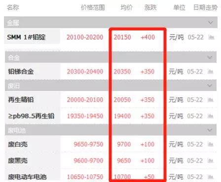 5月22日 周二 鉛價漲400元/噸,均價20150 元/噸