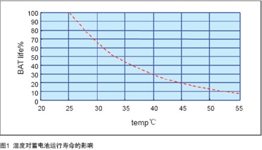 失水的途徑比較多:節流閥設計不合理,頻繁開啟;電源對蓄電池頻繁均充;環境溫度過高。其中高溫是最主要的因素,高溫會加速蓄電池失水速度,導致蓄電池容量下降。以25℃為基準,當蓄電池運行環境上升10℃,壽命減少50%,如圖1所示。
