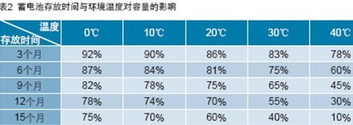 蓄電池在存放過程中存在自放電,如果長時間得不到補充,就會出現硫酸鹽化現象。這種現象如果沒有得到及時改善,蓄電池容量會降低甚至損壞不能使用。蓄電池在存貯過程中,環境溫度對容量影響也非常大,如表2所示。